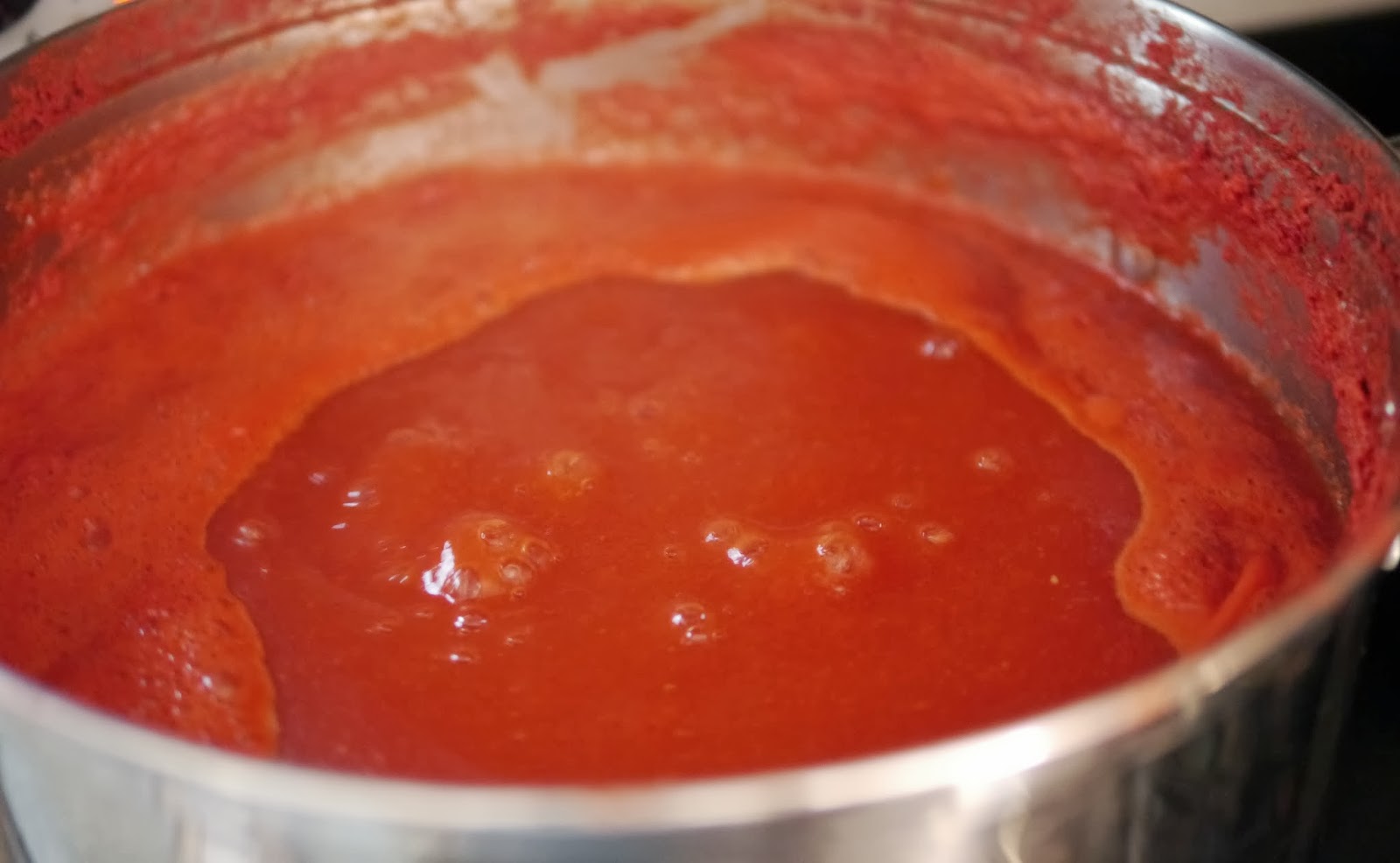 Ultimately it’s up to you to decide how long to boil the sauce. If you want your sauce thin boil it less and if you want it thick boil it longer. I simmer my sauce down by one-third of it’s volume which give me a medium consistency sauce. Tip: As the sauce boils down the (in)sides of the pot will be covered with a thick tomato paste, be sure to scrape the paste and mix it back into the sauce.