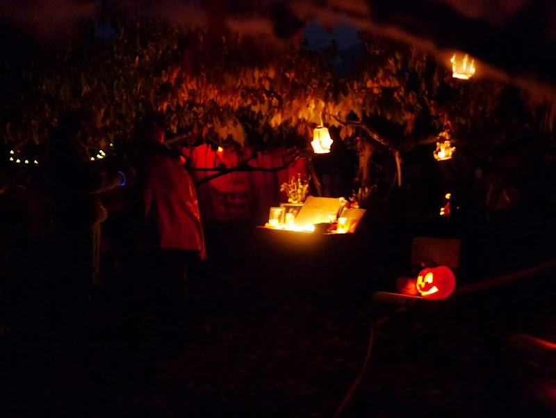 Tonight was the most spooktacular All Hallow’s Eve celebration that I have ever taken part in. I hope that it becomes an annual event! It was the perfect mix of community, adventure, surprise, treats and cheese (err… I mean food). We began our celebration around three in the afternoon. Families gathered at the farm and decorated the orchard trees in a variety of Halloween inspired decor. There were ghosts, bats, owls, spider webs, eyes, bones (real ones!), lanterns and lights. At the base of the trees were Jack-o-Lanterns and skeletons. The decorations were beautiful, truly. There was a table in honour of those that has passed before us, a homage to the Day of the Dead.