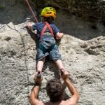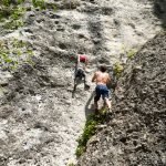 This rock climbing area is not huge but there are a few easier climbs that kids can try out. By following the trail straight up from the pull out to the rock wall you encounter Rad Wall. Rad Wall has a couple easier 5.9 routes but beware of the poison ivy everywhere! My two older kids (9 and 7) were able to climb The Good (5.9) on Rad Wall fairly easily. The wall to the left is called the Pocket Wall (because it’s covered in pockets) and there’s one neat climb there called Pockets of Pleasure (5.10b) that we all tried out.