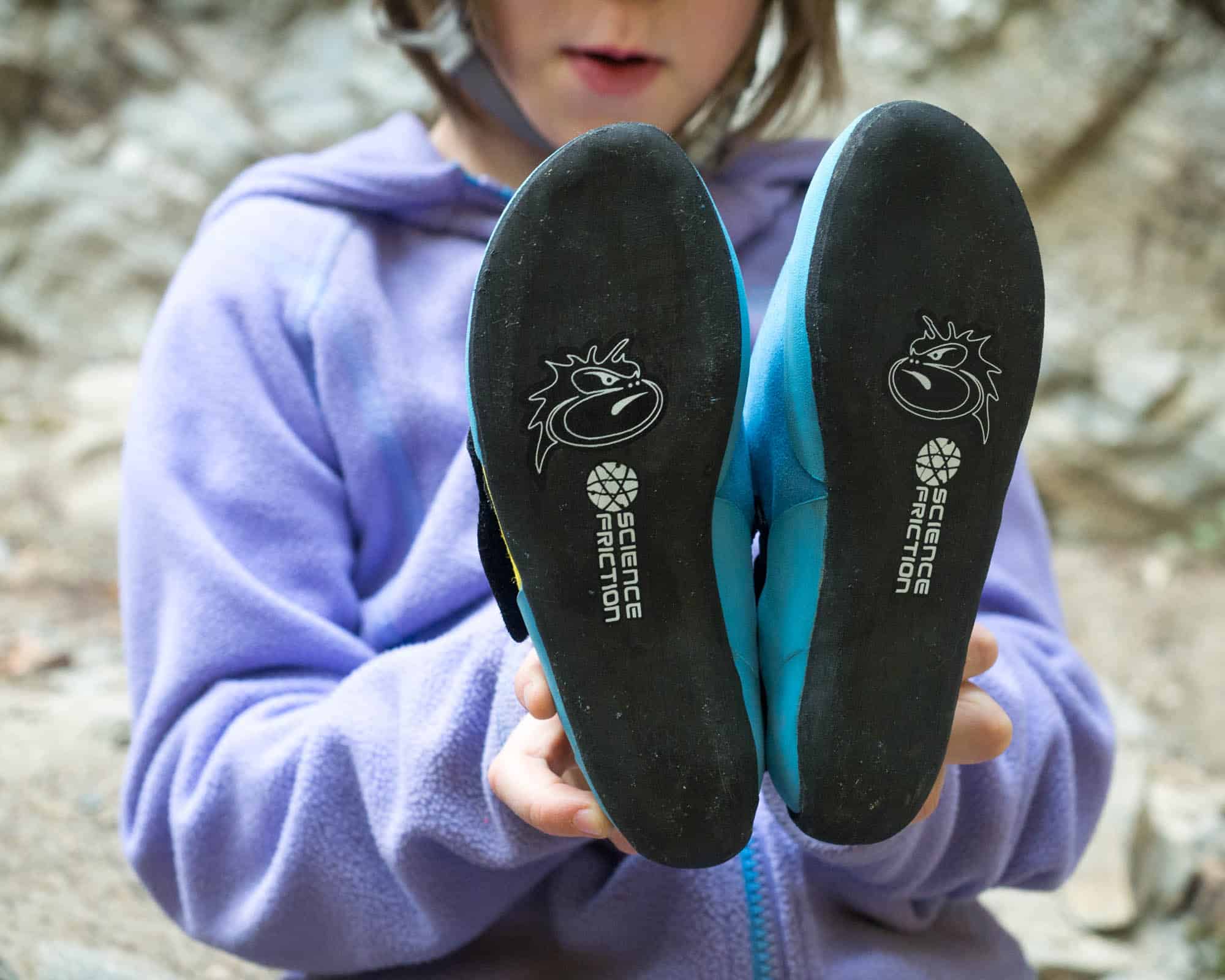 The Mad Monkey 2.0 climbing shoes are designed to be super soft and supple so that kids are happy wearing them all day long. The tops of the shoes are made out of stretchy SynFlex upper and their R2 rand system for ultra comfort. This means there’s no pinching or scratching around little ankles and no need to “break” them in. My daughter wore her Mad Monkey 2.0 climbing shoes for three hours straight the first time with no complaint.