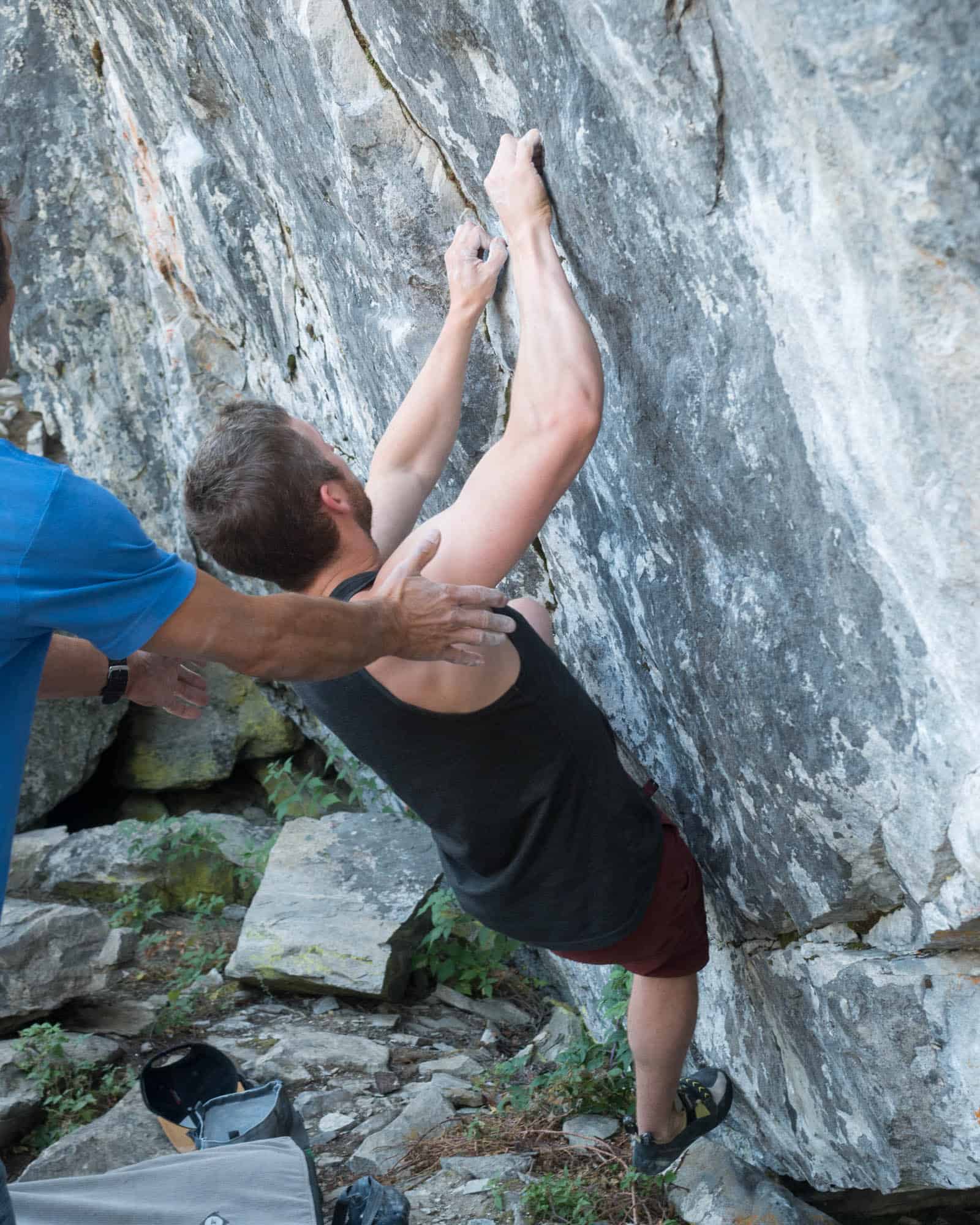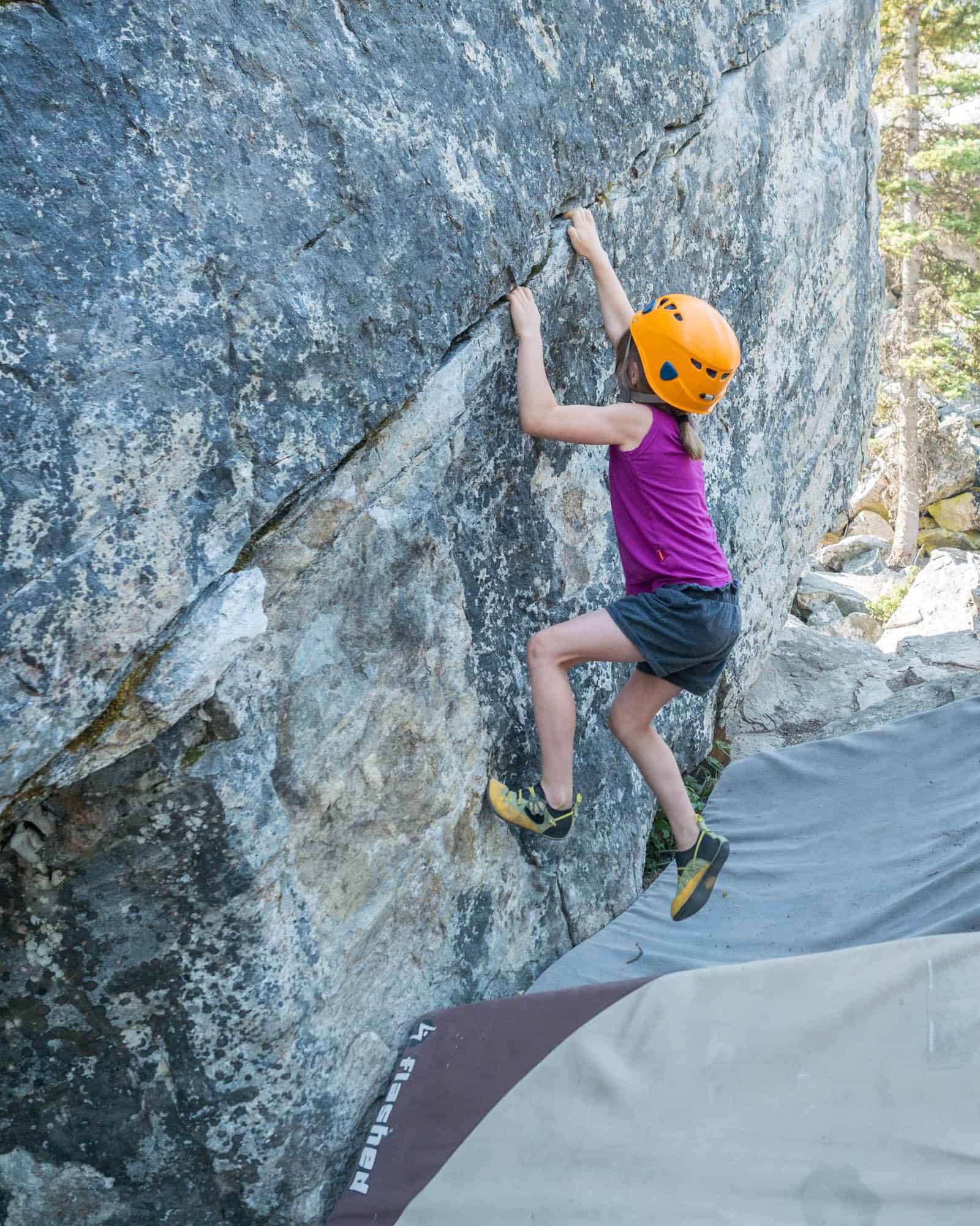 When choosing a place to bring your kids bouldering outside, find a location that is relatively easy and safe to access. Also, find a boulder that has a wide and safe landing (base at the boulder). Choose boulders that aren’t too tall and choose routes that are easy to climb. The trickiest part of bouldering with kids is finding the right place to go. Tip: If aren’t sure where to go, ask around a your local indoor climbing gym.
